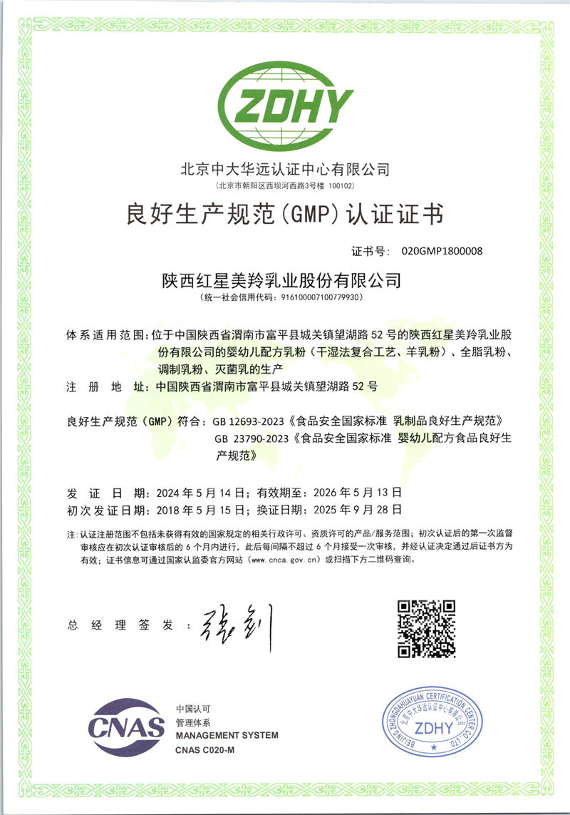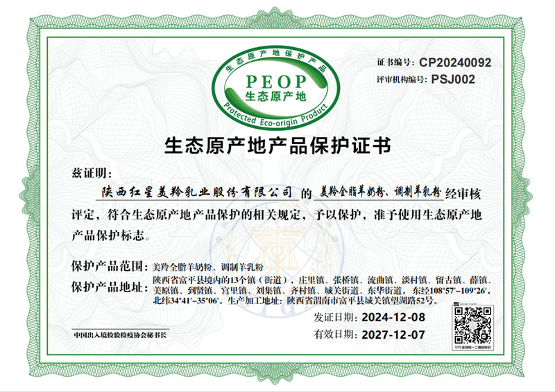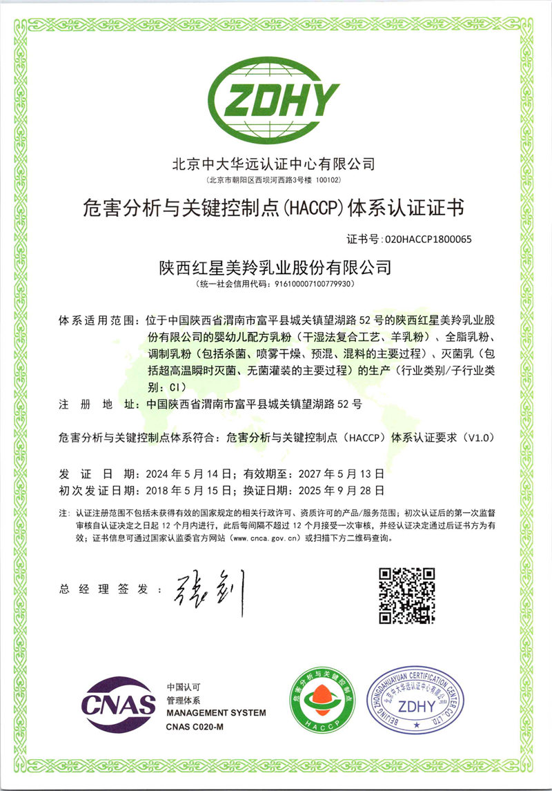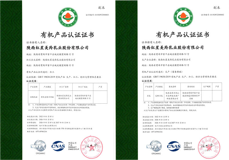 红星美羚自建自控奶源基地,组建美羚羊牧业集团,以“育好地、种好草、养好羊、产好奶”绿色有机、生态循环的发展为主线,全球选育并引进奶山羊良种,以奶山羊生态养殖为理念,打造科学养殖体系及良种繁育体系,从源头确保品质。企业通过了ISO9001管理体系、乳制品HACCP、GMP认证和 HALAL(国际清真食品)认证。