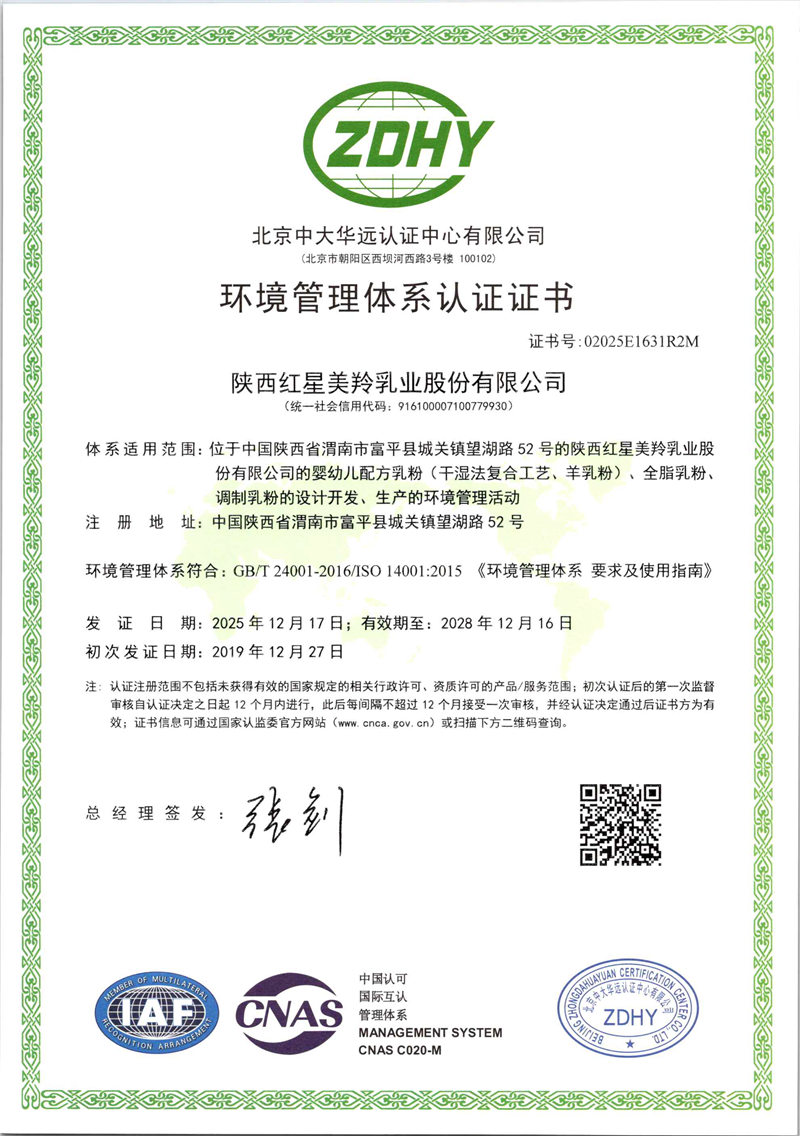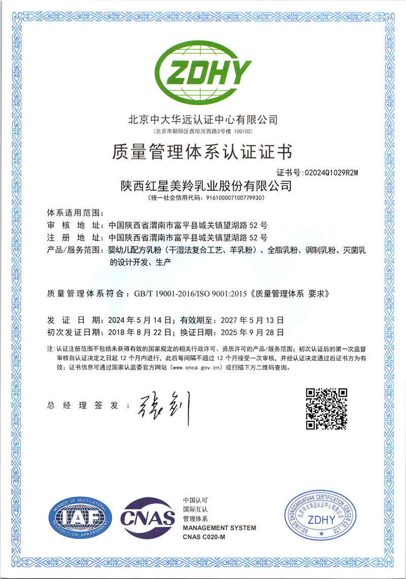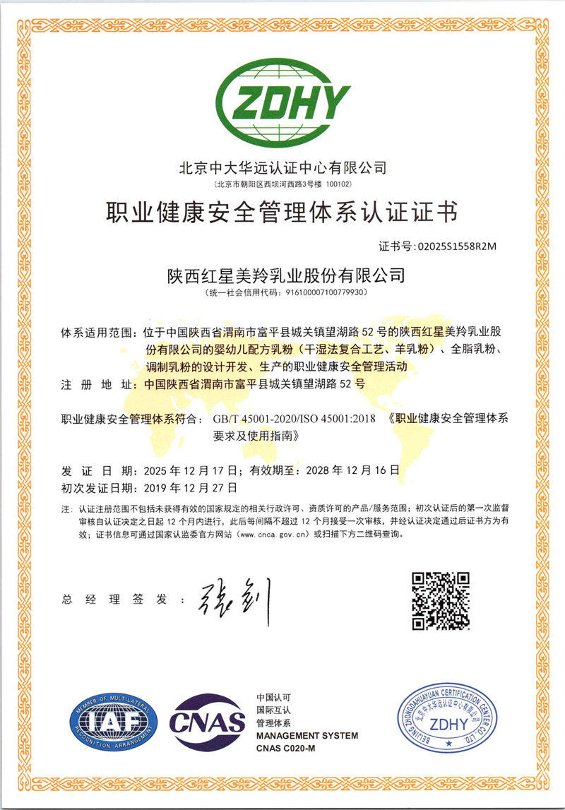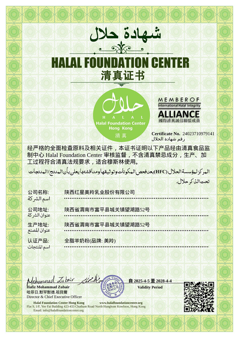 红星美羚自建自控奶源基地,组建美羚羊牧业集团,以“育好地、种好草、养好羊、产好奶”绿色有机、生态循环的发展为主线,全球选育并引进奶山羊良种,以奶山羊生态养殖为理念,打造科学养殖体系及良种繁育体系,从源头确保品质。企业通过了ISO9001管理体系、乳制品HACCP、GMP认证和 HALAL(国际清真食品)认证。